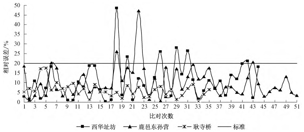 通常認(rèn)為枯水期、平水期、豐水期3個時期地表水中的有機物和無機物含量的比例會有所差別, 導(dǎo)致轉(zhuǎn)換曲線的適用性不強。結(jié)合18個斷面的歷史數(shù)據(jù)進行分類篩選, 選取全年水中COD含量較為穩(wěn)定的站點 (睢縣長崗、新野新甸鋪) 和最不穩(wěn)定的站點 (鹿邑東孫營、西華址坊) 3個時期的水樣, 利用實驗室TOC儀器 (差減法) 分析其中的有機碳和無機碳含量, 確認(rèn)其比例。數(shù)據(jù)表明;單個斷面3個時期的水體中, 有機碳和無機碳的比例基本保持在固定的比例波動, 枯水期無機碳的比例較低。根據(jù)2011年第1周~52周比對數(shù)據(jù) (剔除影響比對的斷流、停電等因素) , 自動監(jiān)測數(shù)據(jù)和手工監(jiān)測數(shù)據(jù)相對誤差小于20%的達到85%以上。可以認(rèn)為單個斷面3個時期濃度值的波動, 對轉(zhuǎn)換關(guān)系產(chǎn)生的影響較小。具體見圖5~圖7。